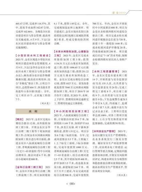 【小 型 农 田 水 利 工 程 建 设】 工程】 2021 年,金东区完成水 成后经过“7·18”洪水考验,保障