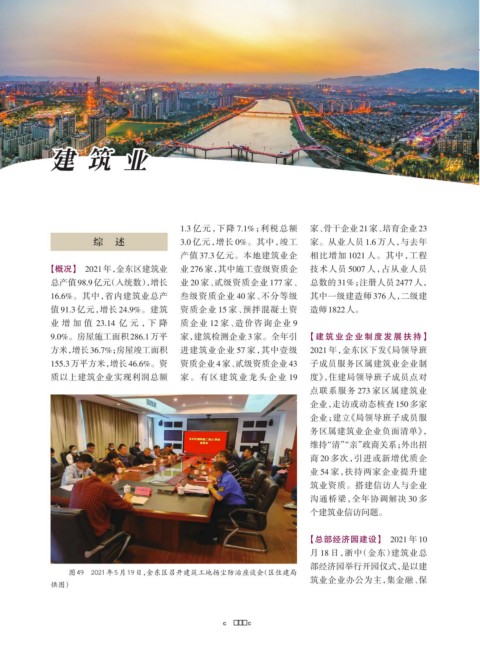 【概况】 2021年,金东区建筑业 业 276 家,其中施工壹级资质企 技术人员 5007 人,占从业人员