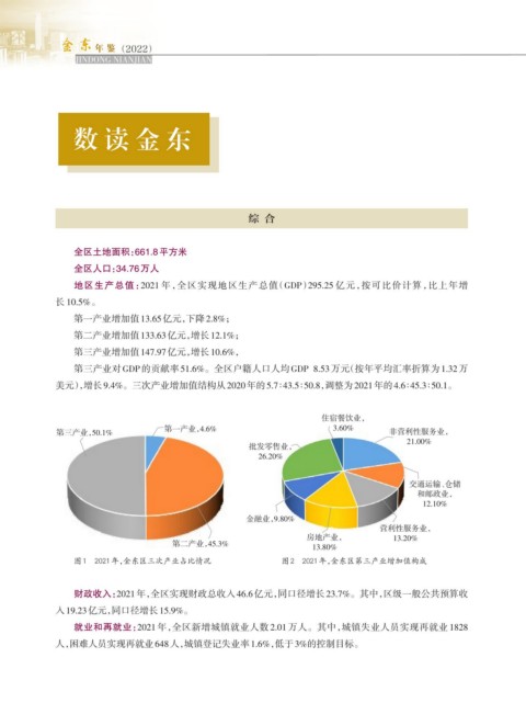 图1 2021年,金东区三次产业占比情况 图2 2021年,金东区第三产业增加值构成
