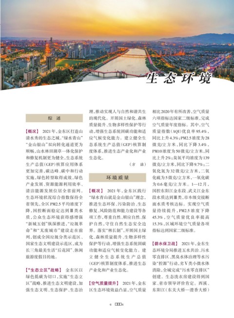 【概况】 2021年,金东区打造山 动,增强生态系统固碳功能和适 质量指数(AQI)优良率 95.4%,