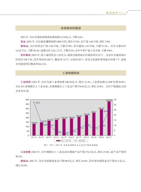 图3 2011—2021年,金东区规模以上工业总产值及其增速