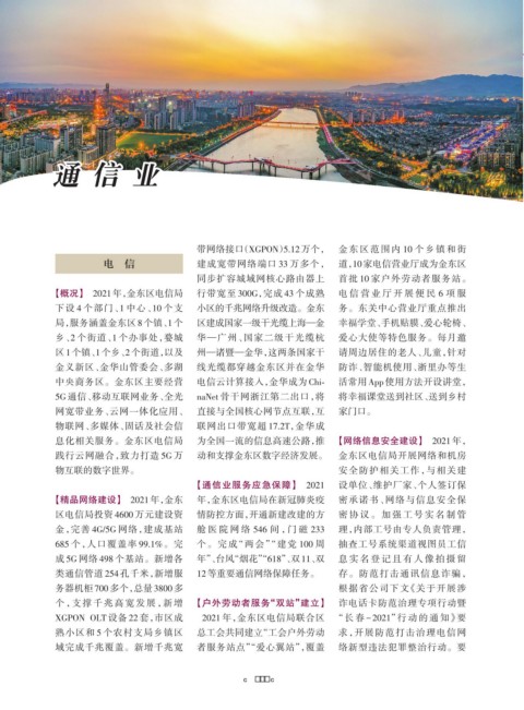 【概况】 2021年,金东区电信局 行带宽至 300G,完成 43 个成熟 电 信 营 业 厅 开 展 便 民 6 项 服