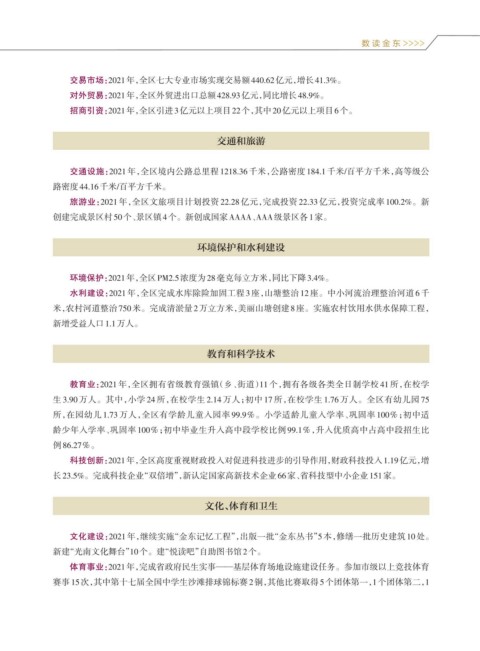 文化建设:2021年,继续实施“金东记忆工程”,出版一批“金东丛书”5本,修缮一批历史建筑10处。