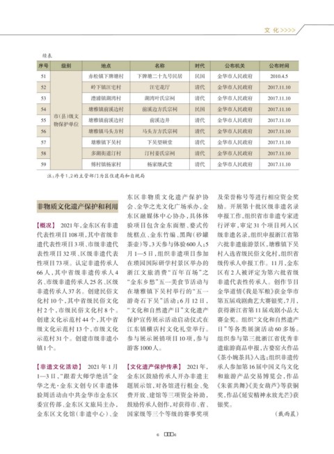 【概况】 2021年,金东区有非遗 验项目包含金东面塑、婺式传 行评审,审定 31 个项目列入区
