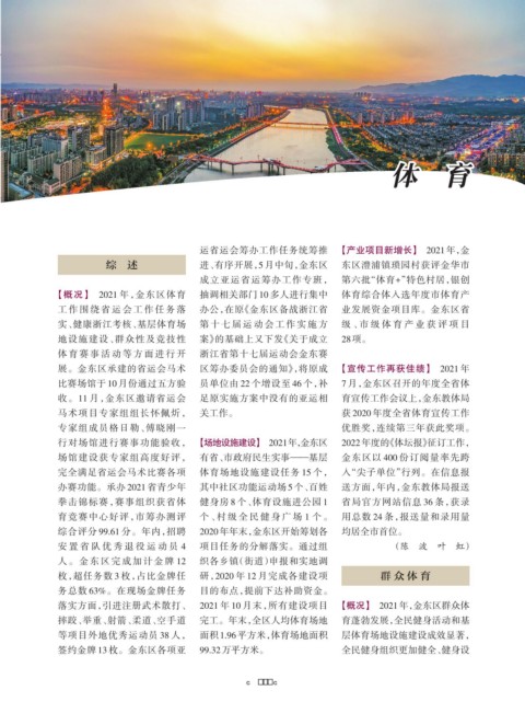【概况】 2021 年,金东区体育 抽调相关部门 10 多人进行集中 体育综合体入选年度市体育产