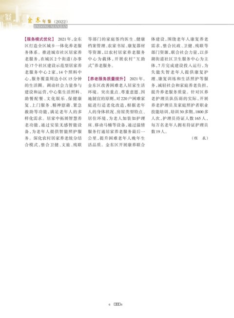 【服务模式优化】 2021 年,金东 等部门的家庭签约医生、健康 体建设,围绕老年人康复养老