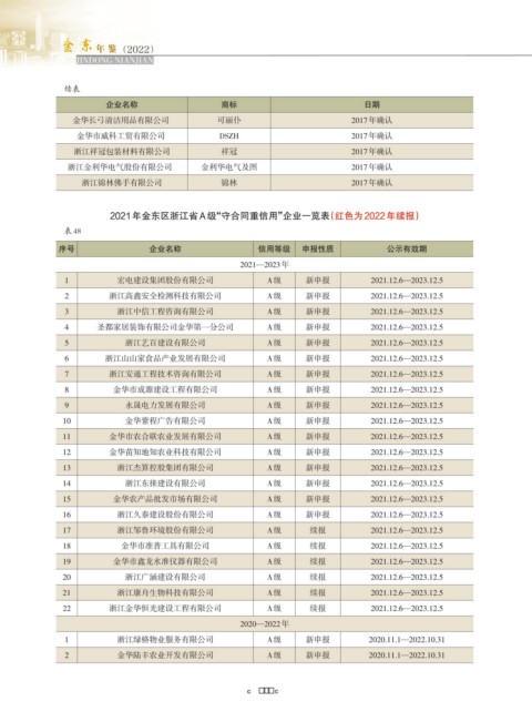 2021年金东区浙江省A级“守合同重信用”企业一览表(红色为2022年续报)