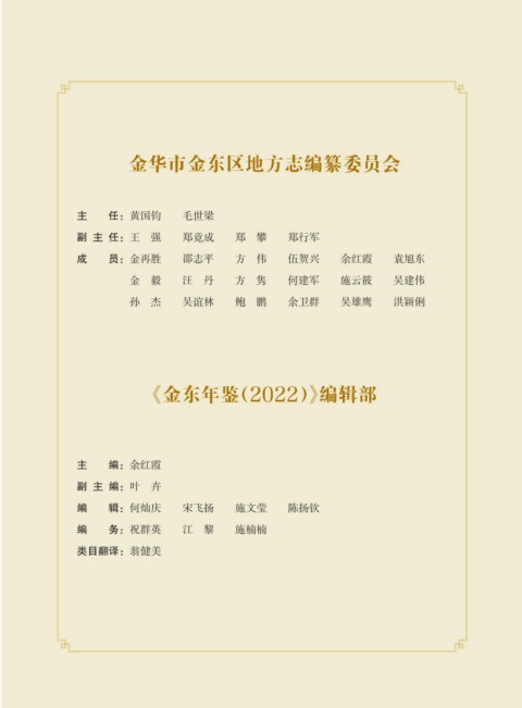 金华市金东区地方志编纂委员会 主 任:黄国钧 毛世梁 副 主 任:王 强 郑竟成 郑 攀 郑行军 成 员:金再胜 邵志平 方 伟 伍贺兴 余红霞 袁旭东 金 毅 汪 丹 方 隽 何建军 施云筱 吴建伟 孙 杰 吴谊林 鲍 鹏 余卫群 吴雄鹰 洪颖俐 《金东年鉴(2022)》编辑部 主 编:余红霞 副 主 编:叶 卉 编 辑:何灿庆 宋飞扬 施文莹 陈扬钦 编 务:祝群英 江 黎 施楠楠 类目翻译:翁健美