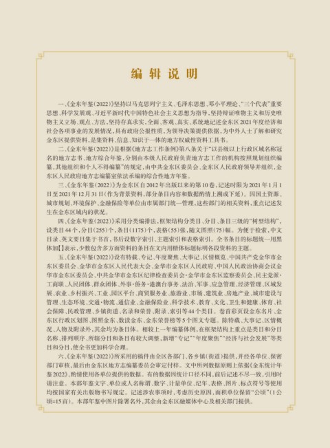 三、《金东年鉴(2022)》为金东区自 2012 年出版以来的第 10 卷,记述时限为 2021 年 1 月 1