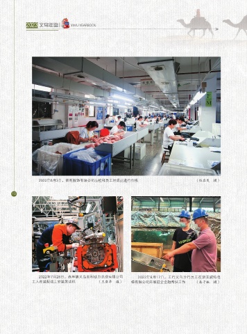 2023 义乌年鉴 YIWU YEARBOOK 2022年6月3日,荣利服饰有限公司品检部员工对成品进行分拣 (任后发 摄) 10 2022年7月28日,赤岸镇义乌吉利动力总成有限公司 2022年8月17日,工行义乌分行员工在浙江威特电 工人在装配线上安装发动机 (王康华 摄) 梯有限公司开展驻企金融帮扶工作 (朱子航 摄)