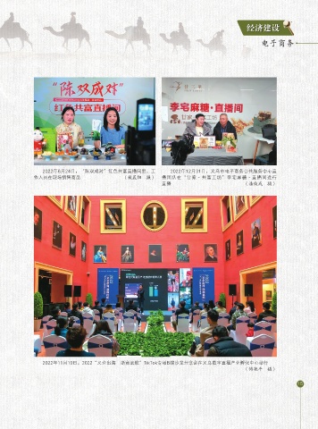 经济建设 电子商务 2022年6月24日,“陈双成对”红色共富直播间里,工 2022年12月31日,义乌市电子商务公共服务中心直 作人员在现场销售商品 (候晨阳 摄) 播团队在“廿家·共富工坊”李宅麻糖·直播间进行 直播 (潘俊成 摄) 2022年11月19日,2022“义企出海 浙商远航”TikTok专场B端沙龙分享会在义乌数字直播产业孵化中心举行 (傅艳平 摄) 15