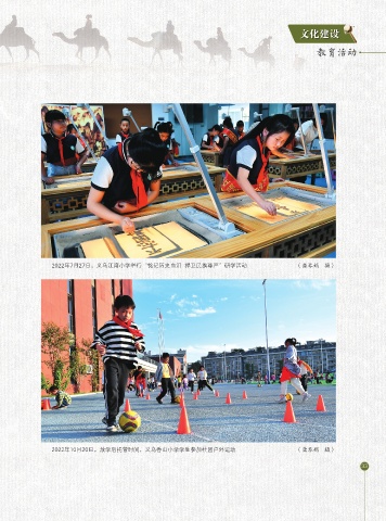 文化建设 教育活动 2022年7月27日,义乌江湾小学举行“铭记历史血泪 捍卫民族尊严”研学活动 (龚琴娟 摄) 2022年10月20日,放学后托管时间,义乌香山小学学生参加社团户外运动 (龚琴娟 摄) 33