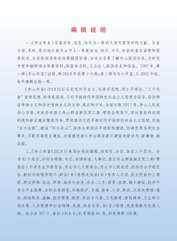 二、《舟山年鉴(2018)》采用分类法编辑,设类目、分目、条目三个层次。全