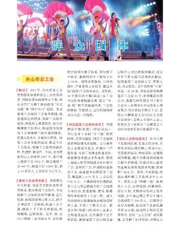【概况】 2017 年,舟山市总工会 镇(街道)工会改革试点。至年底, 示范工会 28 家,评比表彰市级模