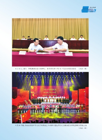 2015 2016 2017 2018 2019 2020 8 月 16 日,甬舟一体化推进会在宁波举行。图为市长何中伟(右)代表舟山签订协议 (沈磊/摄) 9 月 29 日晚,舟山市庆祝中华人民共和国成立 70 周年大型音舞诗《光辉历程》在普陀保利大剧院上演 (沈磊/摄)