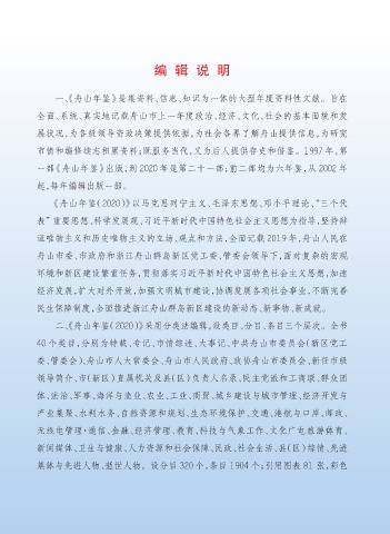 二、《舟山年鉴(2020)》采用分类法编辑,设类目、分目、条目三个层次。全书