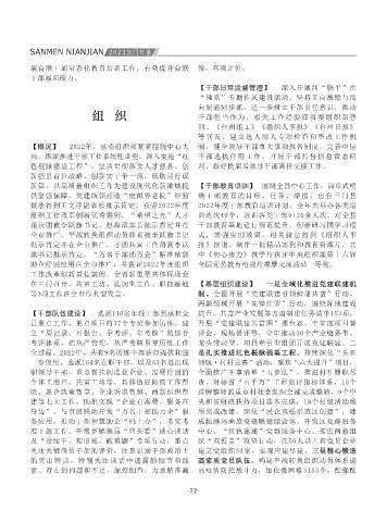 进一步加强和改进青少年网络思政教育工作的通 风景和风土人情,提升三门县对外影响力和美誉 设现场推进会;县工商联在全省清廉民企推进会 畲乡”品牌,深化涛头村与仙居上吕村民族版 市级统战工作示范阵地。 确县领导领衔包抓乡镇(街道),每周明确一天 党日等方式,组织全县干部职工认真学习。开展5 开发“全面从严治党”核心课程体系,包含“理 低”改革,党建联盟、推进领导干部能上能下等 【概况】 2022年,全县创成老龄健康医养结合远 一。“老有帮”应用经验做法得到副省长王文序