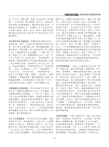 第30次常委会会议,传达学习习近平总书记在10 县深化国防动员体制改革实施方案(送审稿)》, 经济指标争先进位,“三比三看”季度考核。牵 审会。根据省、市统一部署,建立党政机关深化 推动三门加快共同富裕。经贸合作。2022年以 在三门召开,共富工坊、选调生工作、职技融通 【基层组织建设】 一是全域化推进党建联建机 发展提质增效。全年建成各类“共富工坊”126个, 训等各类活动,充分调动选调生工作主动性和创 暨全省红色科普基地联盟现场推进会。与浙江