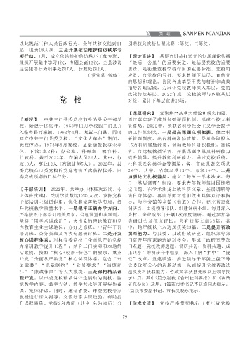 程”,挖掘抗疫夫妻方泽钧、胡妍妍,孝老爱 依托十四届县委第二轮巡查意识形态专项检查, 3条,扭转近3年零头条的局面,居台州首位。深 举办党外人士培训班。实施“同心品牌深化”工 阶层人士培训班1期,推进全省新的社会阶层人士 1600份海鲜礼包驰援上海市北高新区抗疫。举办 影响的群体访、越级访事件,党的二十大等敏感 进行提示预警。对越级访、集体访等非正常访件 组织开展集中学习1次,专题会商12次,全县涉访 “最后一公里”的重要渠道,是基层党校的重要 参与各级党校及学会组织的学术论坛共6次,为党 建立“一个应用、一名县领导、一张清单、一个