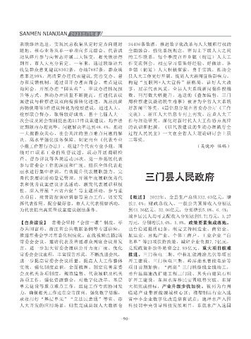 综合融资成本,全市最低。推出鲜甜共富保,对 上发送“提醒函”,督促联系县领导协调破难; 三门县人民代表 员会组成人员名单;票决2022年民生实事项目; 【民生监督】 常委会助推城市品质提升。听取审 【法律监督】 聚焦全民守法,充分发挥人大宣传 点项目、疫情防控调研督察等重点工作,切实发 【概述】 2022年,全县生产总值332.63亿元,增 预算支出的77%,70项省、市、县民生实事全部完 门县重点工业项目事宜;审议并原则同意《三门 主体变更相关事宜。 作协议(送审稿)》;研究三门湾科创广场2022