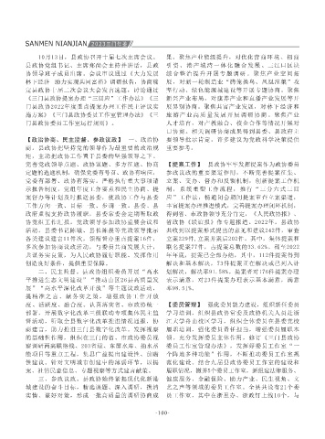 平新时代中国特色社会主义思想学习座谈活动, 想学习座谈活动实施方案》。 工作方向一致、目标一致、步调一致。县委、县 丰富提案办理推进模式,完善提案办理闭环机制, 团结、宗教和谐。密切联系上级政协、兄弟县市 工作高质量发展,党风廉政建设和反腐败斗争取 县委开展纠“躺平”治“佛系”专题作风建设活 【队伍建设】 落实机关党建责任制,严格执行 听取巡察汇报、研究巡察工作。县委书记把巡察 工作,着力补短板、强弱项,固优势、提能力。