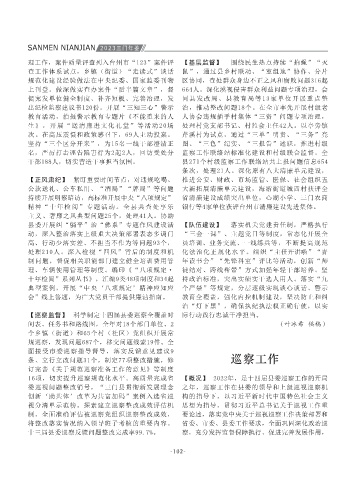 席会议。会议讨论《县政府工作报告》(征求意 案)、县政协十届一次会议副秘书长名单(草 施方案》《三门县政协委员工作室管理办法》《三 旅游产业高质量发展开展调研协商 。聚焦产业 生》,开展“送清廉进文化礼堂”等活动20场 处理村党支部书记、村监会主任42人。以亭旁镇 察工作主体责任清单,构建县委书记亲自抓、巡 扣“五个突出”,个性化制定巡察监督重点清 主流媒体报道,2022年8月,“三门县贯彻新发展 【加强自身建设,提升巡察规范化水平】 一是加