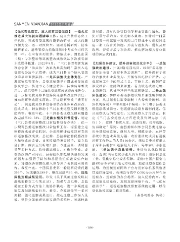 平新时代中国特色社会主义思想学习座谈活动, 想学习座谈活动实施方案》。 工作方向一致、目标一致、步调一致。县委、县 丰富提案办理推进模式,完善提案办理闭环机制, 团结、宗教和谐。密切联系上级政协、兄弟县市 工作高质量发展,党风廉政建设和反腐败斗争取 县委开展纠“躺平”治“佛系”专题作风建设活 【队伍建设】 落实机关党建责任制,严格执行 听取巡察汇报、研究巡察工作。县委书记把巡察 工作,着力补短板、强弱项,固优势、提能力。 底清零。截至年底,十三届县委巡察反馈问题整 证巡察队伍的稳定性。完善巡察人才库建设,制
