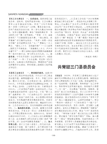 总工会打造“疗休养金名片”》在全省工会保障 消费帮扶过程中的积极作用,2022年消费帮扶采购 管理力度。召开三门县工会第十二次代表大会, 研究制定《三门县青年发展型城市建设方案》。 表现个人和集体,获评全国优秀少先队员1名。 【推动改革创新】 一是深化基层团组织改革。扎 带头学,基层妇联结合爱粮种粮行动、美丽庭院 升全县妇联干部执委的履职能力和综合素养。三 县美丽庭院创建工作推进会,将美丽庭院创建纳 项目(三期)优秀执行单位称号。三是未成年人