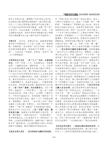 被《浙江省总工会简报》15期专刊录用。《三门 数改试点项目——困难职工帮扶应用已基本完成 人以上职工的企业动态覆盖,25人以上职工的企 【综述】 2022年,共青团三门县委坚持以习近平 立100周年大会精神座谈会,深化“理润青年”行 局”系列青创活动。持续做强环三门湾新青年联 儿”9篇,市级媒体报道55篇。撰写“共同富裕与 坊派单155次,累计为73名创业女性发放“巾帼共 开辟“三防”教育新路径,暑期两个月共开展相 准化试点工作落地见效,出台《三门县社区(村) “5·15”国际家庭日、“11·25”国家反家暴日等