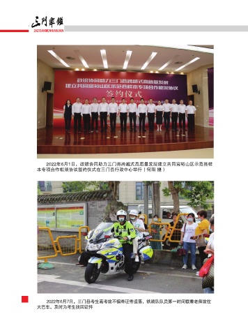 2023SANMENNIANJIAN 2022年6月1日,政银协同助力三门县跨越式高质量发展建立共同富裕山区示范县样 本专项合作框架协议签约仪式在三门县行政中心举行(何阳 摄) ̾̽ 2022年6月7日,三门县考生高考前不慎将证件遗落,铁骑队队员第一时间载着老师前往 大巴车,及时为考生找回证件
