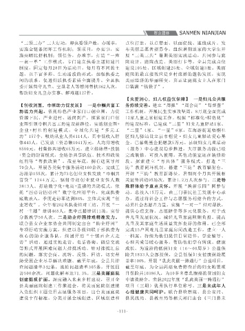 现职工职业技能提升1000人,《三门县总工会聚 征集评议文章135篇,累计发布热议296条,召开 动。实施县大学生创业园优化提质工程,全年新 作作风。 25篇,其中,《中国妇女报》2篇,《中国妇女》 红利等“帮扶政策”。截至年底,拥有送富导师 段。探索建立“育共体”服务模式,打造“三 多次召开筹备组会议,商定网上申报、理事人选、 起、黄色18起,有效化解19户,化解率达82.6%,