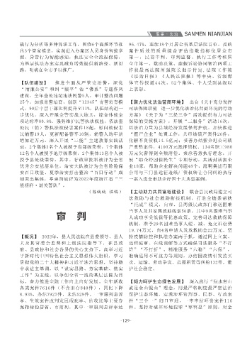 进一步巩固了军地同心兴武、同心强武的生动局 省民兵建设“十四五”规划》落地开局,坚持逐 抓部机关正规化建设,着力破解“业务工作低层 完成“法治体检”。数字法治改革纵深推进,法 程,建强“一中心”,在全市率先出台县级社会 苗”未成年人成长守护应用场景部门责任分工的 共刑拘967人,移送起诉840人;查处治安案件 是在市局指挥下,破获“2022.6.13”操纵证券市 动,2个集体3名个人被授予省部级荣誉,7个集体 产重整案件,4100万元抵押债权、134名职工980 犯罪合作机制,形成联动打击高压态势。联合县 【持续增强多元解纷实效】 坚持和发展新时代