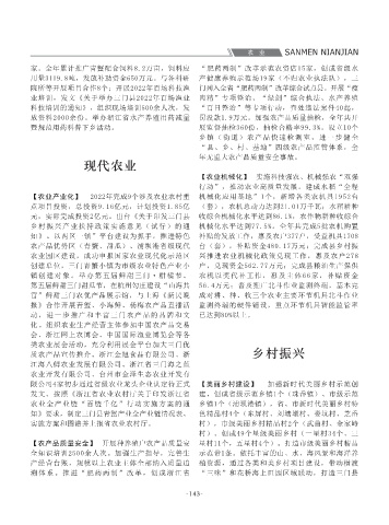 浙江省数字化改革+强村富民试点和浙江省农业标 【茶果蔬生产】 2022年,蔬菜播种面积7.1万亩 入省外动物及其产品982批次,其中生猪358批次 实省2022年水产绿色健康养殖技术推广“五大行 农业园区建设,成功申报国家农业现代化示范区 兴推进农业机械化政策兑现工作,惠及农户278 【农村指导员工作】 完成第13批县派农村工作指 山脚),西至峋岩村养殖塘,北至北塘标坝。总