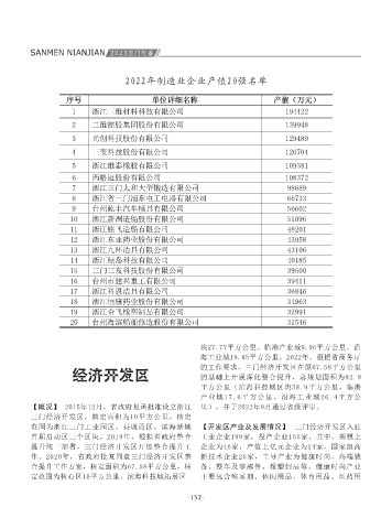 和全市平均值保持一致,规下工业增加值增速 业覆盖率达到70%。50家批量化数字化改造签约10 比重15%(剔除其头山矿后为17.9亿元)。当年入 成套设备、船舶等。2022年,共有规上企业67 作。2020年,省政府批复同意三门经济开发区整 新技术企业26家,主导产业为健康时尚、高端装 编制。产业平台建设方面。为保障重大产业项目 工业标准厂房等12个地块农转用工作快速办结。 会、新春茶话会等活动,架起政企沟通桥梁。全 压实责任抓食品安全,全面梳理食品制作售卖单