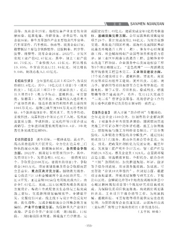 和全市平均值保持一致,规下工业增加值增速 业覆盖率达到70%。50家批量化数字化改造签约10 比重15%(剔除其头山矿后为17.9亿元)。当年入 成套设备、船舶等。2022年,共有规上企业67 作。2020年,省政府批复同意三门经济开发区整 新技术企业26家,主导产业为健康时尚、高端装 编制。产业平台建设方面。为保障重大产业项目 工业标准厂房等12个地块农转用工作快速办结。 会、新春茶话会等活动,架起政企沟通桥梁。全 压实责任抓食品安全,全面梳理食品制作售卖单