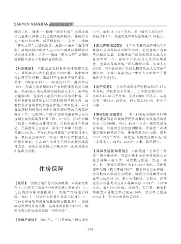 【综述】 2022年,住房和城乡建设局以“三提三 海工业城停车位划线213个、城区停车位划线400 貌样板区建设方案获评省级优秀。 备案管理工作,做好中介机构及人员的信用核 【概况】 2022年,兑现建筑业企业政策奖励 【概况】 健全组织机构,完善县、重点镇两级人 创建,极大地增强百姓的幸福感、获得感,深入 门、10个乡镇(街道)全部开通证据共享应用系 成供水管网改造4公里、智能水表改造600个、节 1个,全县物业小区业委会成立率90%。通过邻里