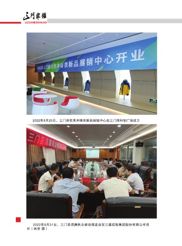 2023SANMENNIANJIAN 2022年8月25日,三门县优秀冲锋衣新品展销中心在三门湾科创广场成立 ̾̓ 2022年8月31日,三门县清廉民企建设推进会在三维控股集团股份有限公司召 开(林芬 摄)