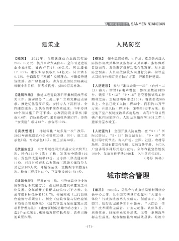 【综述】 2022年,住房和城乡建设局以“三提三 海工业城停车位划线213个、城区停车位划线400 貌样板区建设方案获评省级优秀。 备案管理工作,做好中介机构及人员的信用核 【概况】 2022年,兑现建筑业企业政策奖励 【概况】 健全组织机构,完善县、重点镇两级人 创建,极大地增强百姓的幸福感、获得感,深入 门、10个乡镇(街道)全部开通证据共享应用系 成供水管网改造4公里、智能水表改造600个、节 1个,全县物业小区业委会成立率90%。通过邻里 求责任单位进一步明确要求,对标创建,制定出 目,对灯控路口、人行道、市场周边综合环境进