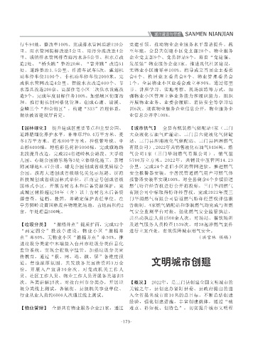 资总额约2.85亿元,投资完成率16.3%,超额完成 门县购房补贴实施细则》,房地产市场逐步回 等棚改项目竣工率已完成100%,交付率已完成 化发展。全年新开工装配式建筑87万平方米,完 【概况】 2022年,县综合行政执法局紧紧围绕全 造提升,共完成改造1座、服务提升3座、开放引 “210”目标,助力优化营商环境。升级公共自行 份 ,开展入户宣讲30余次。对党政机关工作人 域(社区、车站、农贸市场、医院等)的住宅小 做文明有礼三门人”主题实践活动,推进“文明