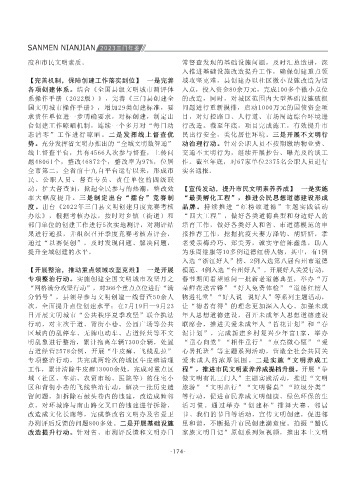 2022年第二批未来社区名单,金麟湖、梧桐2个社 口片区综合开发项目(一期),截至年底,启动 前村获评省级传统村落保护提升考核优秀,启动 市第三。 求,推进优化营商环境,安排专人下沉指导,全 以上。全县已竣工人防工程32个,面积约14万平 扫班组被评为台州市市容环境卫生工作成绩突出 【城乡综合执法】 开展校外培训机构、水行政、 山杉6000棵,增植彩色树种5000棵,完成旗海路 有限公司),2022年共销售液化石油气8436吨。燃 度。出台《2022年三门县文明创建月度竞赛考核 品牌。持续推进“红榜颂道德”主题实践活动