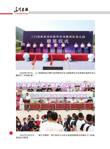 2023SANMENNIANJIAN 2022年9月8日,三门县教育项目集中启动暨西区幼儿园奠基仪式在海游街道西区幼儿 园举行(吴伟超 摄) ̾ͅ 2022年9月20日,“建行共富杯”浙江省助力山区26县篮球联赛总决赛在三门县体 育馆拉开帷幕
