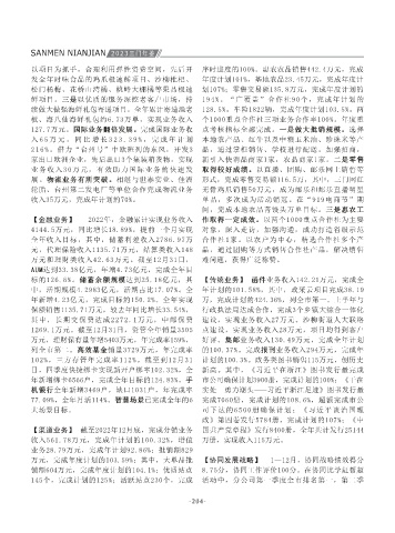 全等职能。 三门县分公司完成业务收入7619万元,同比增长 收入35万元,完成年计划的70%。 单品,多次成为活动销冠。在“919电商节”期 标,公司业务代理金融引荐公司存款净增额项目 并组织开展意识形态工作自查和专项督查。五是 总工会“最美工会户外劳动者站点”,2022年一 达标工作,建立健全三级治安网络责任体系。全 要安全”要求,围绕“多出成绩、多创经验、 控,政企项目开通和故障处理的及时率和回访满