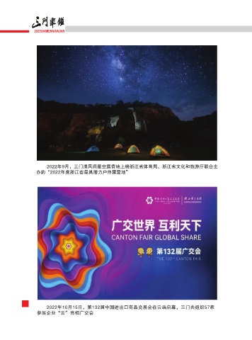2023SANMENNIANJIAN 2022年9月,三门清风洞星空露营地上榜浙江省体育局、浙江省文化和旅游厅联合主 办的“2022年度浙江省最具潜力户外露营地” ̿̽ 2022年10月15日,第132届中国进出口商品交易会在云端启幕,三门共组织57家 参展企业“云”亮相广交会