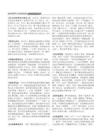 居全省第二,领跑台州;城镇居民人均可支配收 成为货物吞吐龙头企业。做美滨海旅游休闲产 然气保供工作。 通道,疫情防控经费累计支出6462万元。大力支 【税收收入】 2022年,县税务局组织各项税收收 【税费政策落实】 认真落实“五措并举”要求, 与全省“揭榜挂帅”“亩均论英雄改革”项目, 重点工作财力保障。强化物业、食堂等后勤管理 局获评全国工会职工书屋示范点,纳税服务股获 营性收入监测体系。收集农业农村、气象、水 指示批示摘要和中央、国家关于统计工作的《意