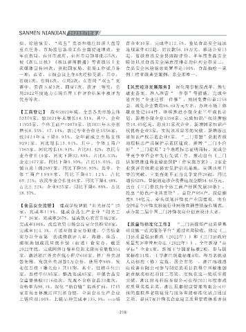 【政策执行审计】 组织开展“5+4”稳进提质政 江审计整改一体化智能管理系统第二批试点工 完成率100%。改造农贸市场食品安全快检室8家, 【质量与标准化工作】 “三门县橡塑产业质量基 制定双随机抽查计划135个,其中本部门84个、跨 竞赛活动优秀单位、2022年省森林火灾应急演练 涉海涉渔、消防、工矿、危化品、建设施工、旅 委,将县属企业的党组织关系一并划入管理,构 县属企业完成股权划转;完成公司全部管理制度