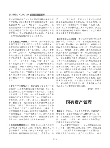 建立健全审计工作重大事项督查督办机制、审计 科研立项课题结项评审中2篇一般科研课题顺利 局2022年度地方市场监管工作评价结果中被评为 歇业备案、准入准营“一件事”等措施,完成全 超额完成省平安考核任务,该项市对县考核指标 安全生产监督管理 【落实安全生产责任】 2022年,县委理论中心组 援队10支,700余人,其中,消防救援分队配备消 整优化国有资本布局结构,重组设立4家一级监管 围绕城市基础设施建设和城市有机更新,浙东南 进行试运行;完成70多个报表数据化编制工作。 目、沿海工业城新能源产业基地及基础设施提升