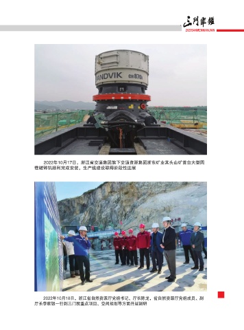 2023SANMENNIANJIAN 2022年10月17日,浙江省交通集团旗下交通资源集团浙东矿业其头山矿首台大型圆 锥破碎机顺利完成安装,生产线建设取得阶段性进展 ̿̾ 2022年10月18日,浙江省自然资源厅党组书记、厅长陈龙,省自然资源厅党组成员、副 厅长李家银一行到三门就重点项目、空间规划等方面开展调研