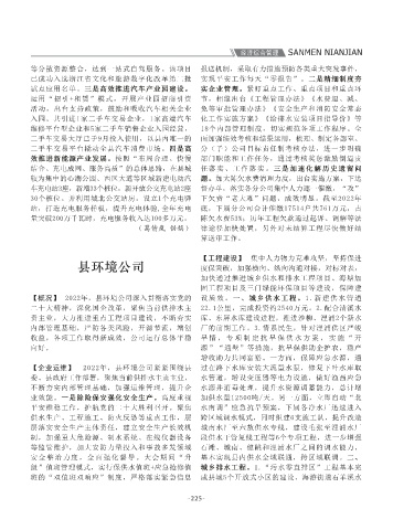 重组实施方案精神,重组更名为三门县资源和能 伏装机容量2240MW,项目投资约100亿。2.注册成 汽车,开通8条农村“微公交”班线,惠及健跳、 量突破200万千瓦时,充电服务收入达100多万元。 陈欠水费53%;历年工程欠款通过起诉、调解等法 旗”项目。四、三门绿能环保(垃圾焚烧发电) 【企业经营】 2022年,环境公司经营业绩稳定,