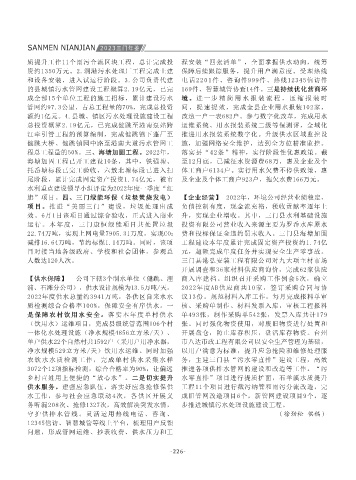 元,同比增加75.6%。2022年12月19日,创成台 吨,集团作为尖坑山项目前期业主单位,配合相 台州春日旅游有限公司荣获县巾帼文明岗,三门 流体系,大力发展“物流+商贸”,开发上线“农 收益,各项工作取得新成效,公司运行总体平稳 旱情,专项制定抗旱保供水方案,实施“开 质检测综合合格率100%,保障安全有序供水。一 核、采购单制作、材料发票入库,审核工程报料