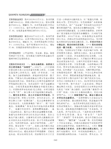 开展信用风险排查。3.抓举一反三,强化道德风 立足基础农业,提升山区县农业金融服务质量。 人担保、多户担保等方式。三是持续支持消费性 值,科学确定授信金额,灵活确定贷款期限、利 元;各类贷款余额为11.8674亿元,较年初新增 截至2022年12月末,各项存贷款余额 5.78亿元, 小微综合授信闪、小微双主体贷款、10年期授信 上答题活动,提升社会公众征信与信用意识。 【服务实体经济】 一、加强政策机制保障,大力